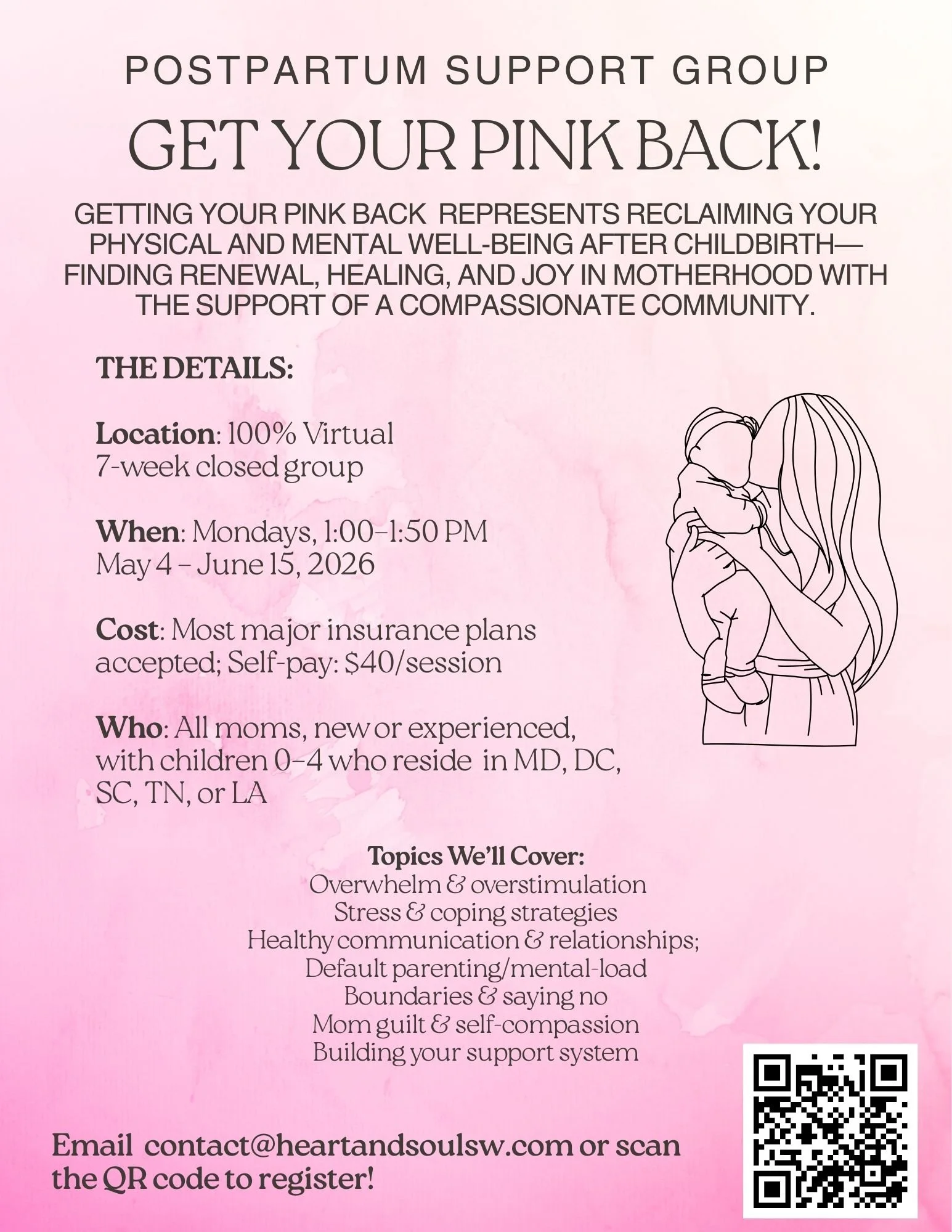 To sign up for our VIRTUAL Postpartum Support Group- Get Your Pink Back, please click on the flyer to open the registration link, or contact us at Heart and Soul Social Work, LLC